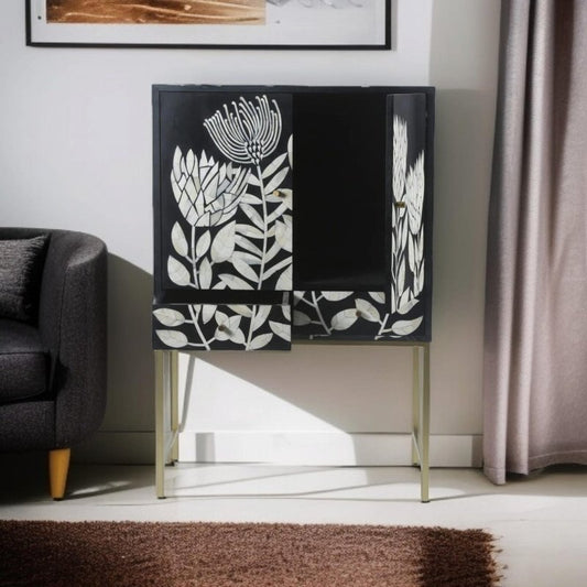 Handmade Bone Inlay Black Tulip Design with One Cabinet And Two Drawer
