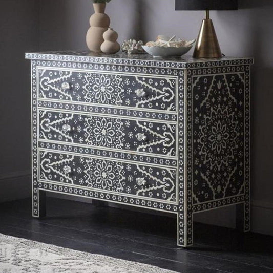 Handmade Bone Inlay Chest or Three Drawers Dresser in Black Color