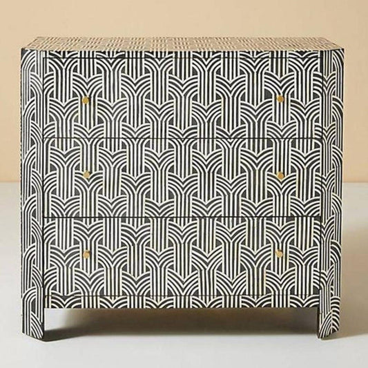Handmade Bone Inlay Chest of Three Drawers in Black Color Chevron patterned