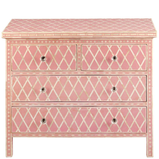 Handmade Bone Inlay Chest of 4 Drawers Geometric Design in Pink Color | Handmade Bedroom Storage Unit