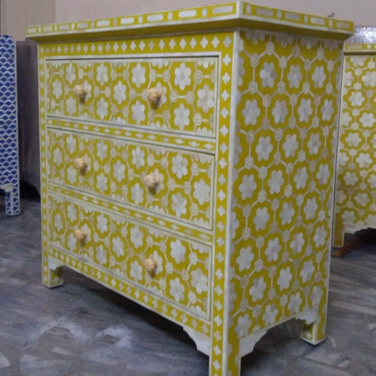 Handmade Bone Inlay Floral Design Chest of Three Drawer Dresser in Mustard Color
