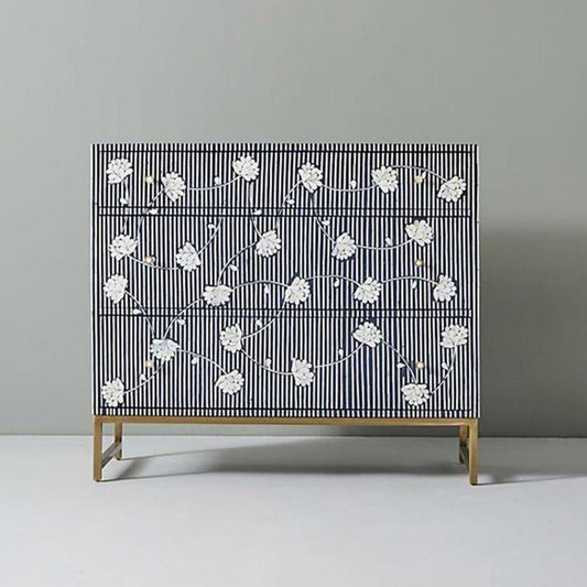 Handmade Bone Inlay Chest of Three Drawers Floral Design in Navy Blue with Brass Stand