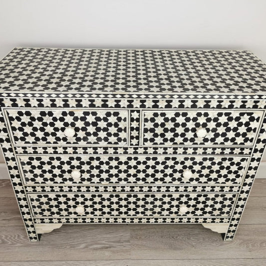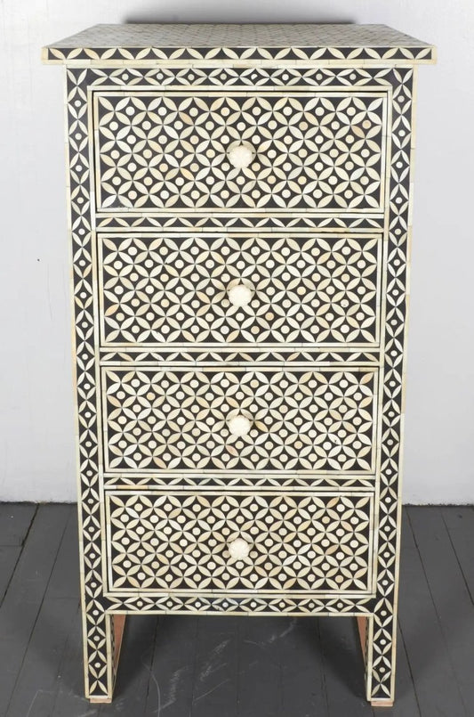Handmade Bone Inlay Targua Chest of Four Drawers in Black & White Color