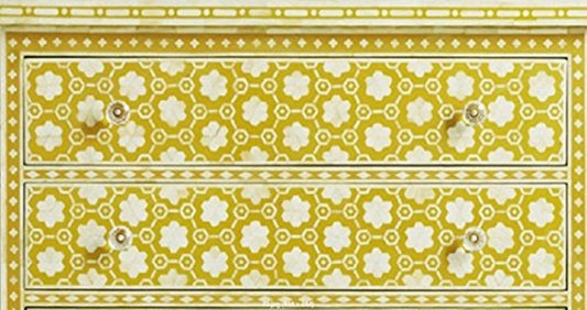Handmade Bone Inlay Chest of Three Drawers Floral Design in Yellow Color | Bedroom Dresser