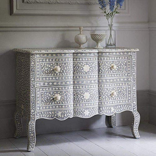 Handmade Bone Inlay Four Drawer Colonial Dresser | Light Gray Color French Chest of Drawers