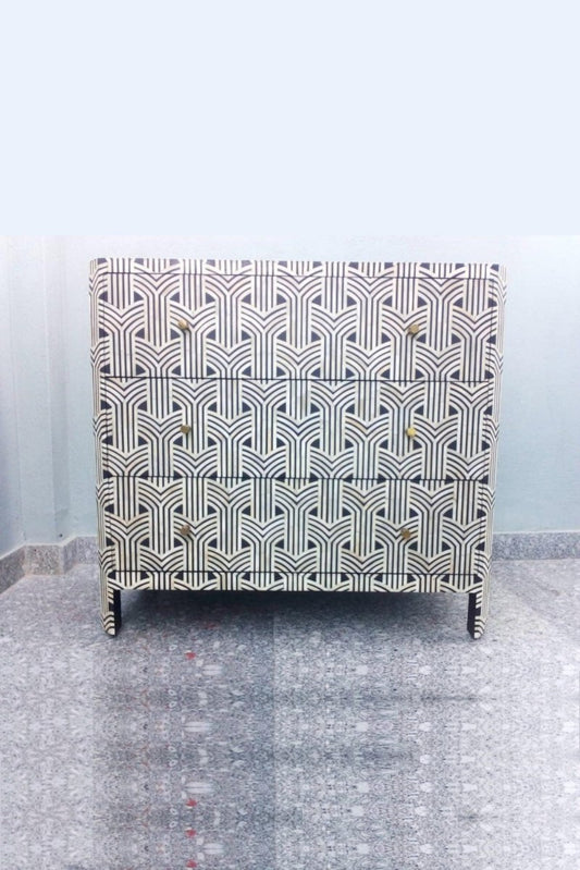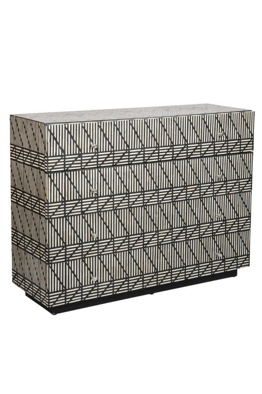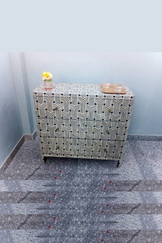 Handmade Bone Inlay Targua Chest of Four Drawers in Black & White Color