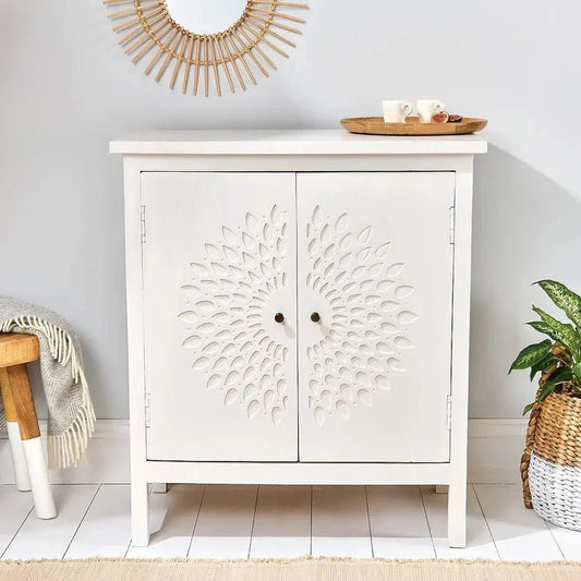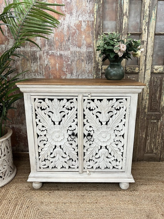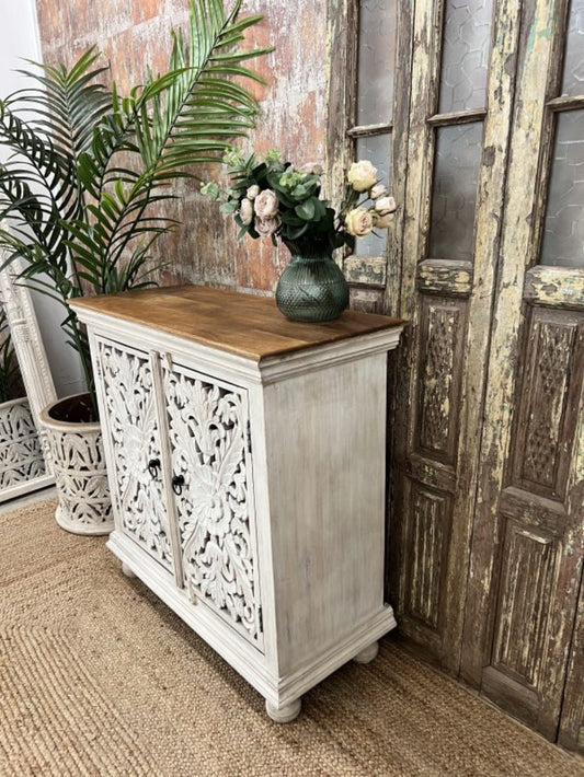 Hand Carved White Color Cabinet | Two Door Small Sideboard