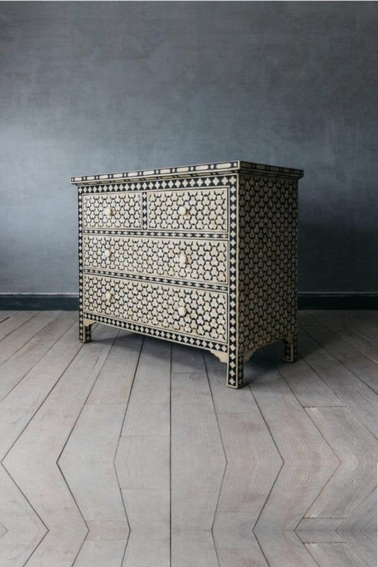 Handmade Bone Inlay Targua Chest of Four Drawers in Black & White Color