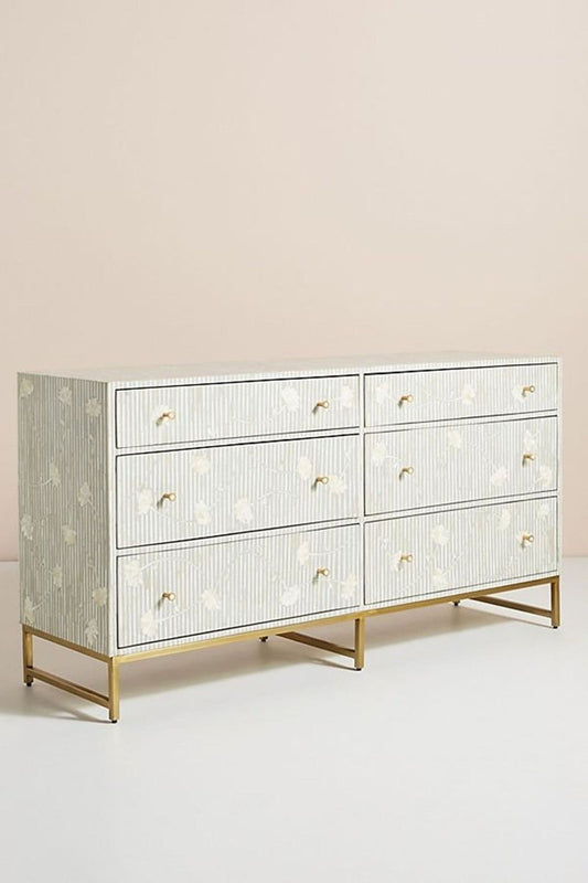 Handmade Bone Inlay Optical Design Chest of Six Drawers in White Color Storage Unit