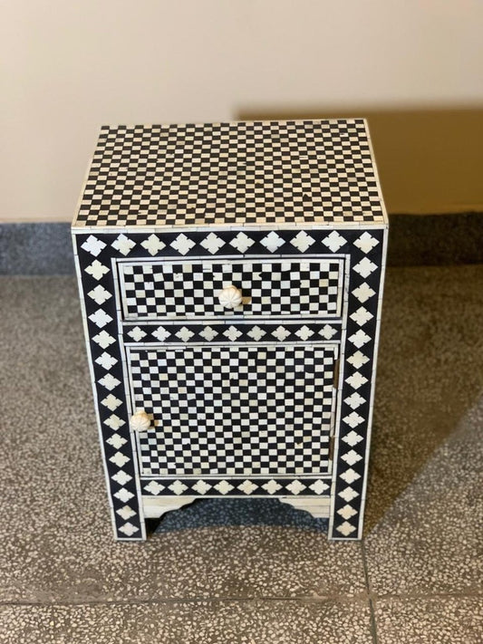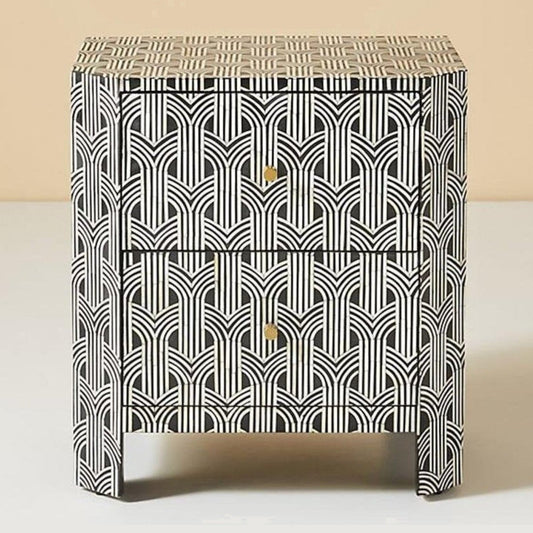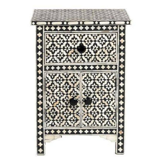 Handmade Bone Inlay Geometric Bedside Black Color with Two door and One Drawer