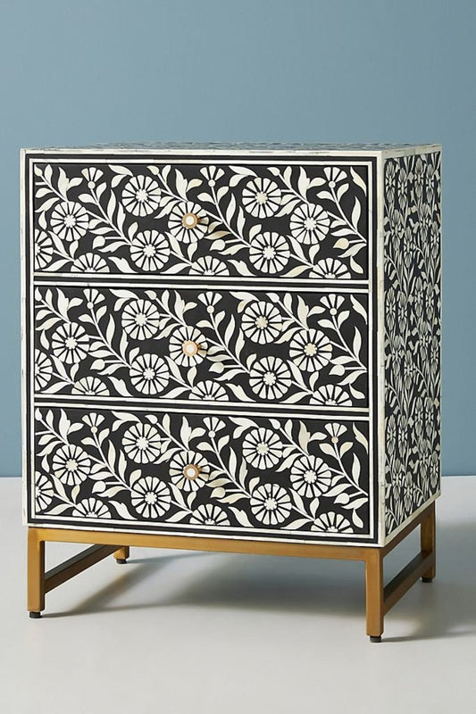 Handmade Bone Inlay Sunflower Design Three Drawers Nightstand Black Color