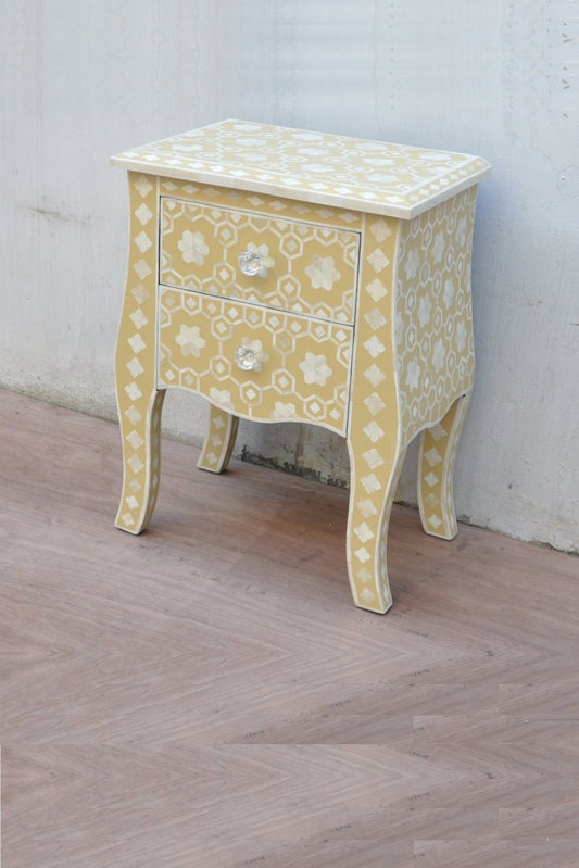 Handmade Exclusive Bone Inlay Floral Pattern Nightstand with Two Drawer
