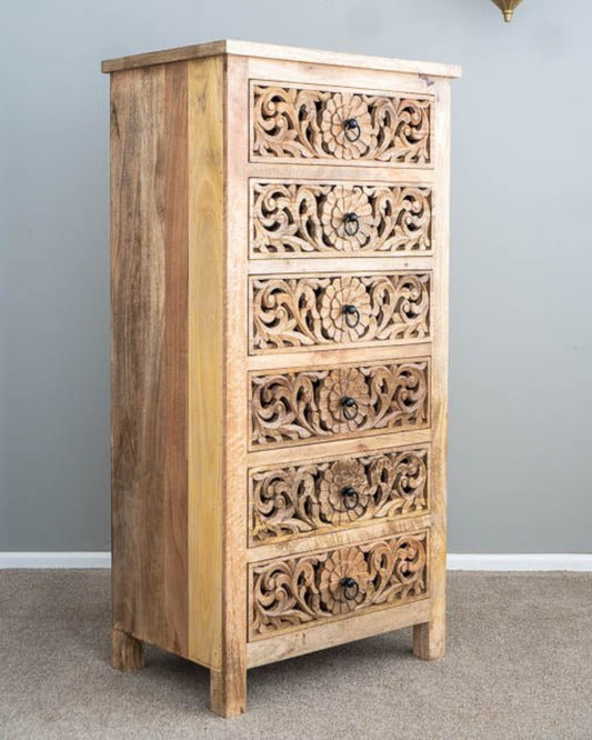 Hand Carved Indian Flower Dresser | Tallboy Chest of Six Drawers