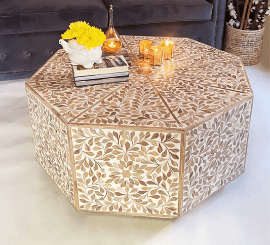 Handmade Floral Design Bone inlay Octagonal Coffee Table with Drawers
