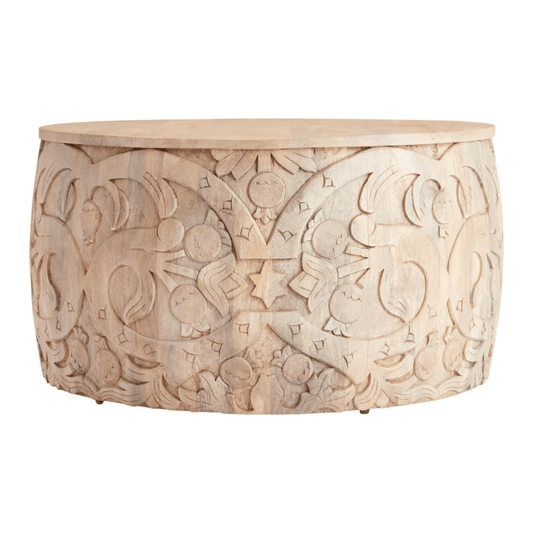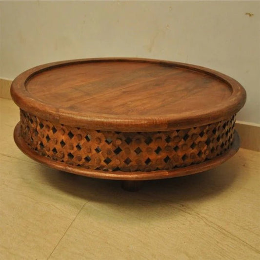 Artisan-Carved Rustic Natural Mango Wood Round Cocktail Coffee Table