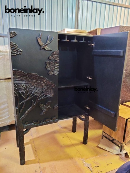Hand Carved Black Color Land & Sky Bar Cabinet | Liquor Cabinetry furniture