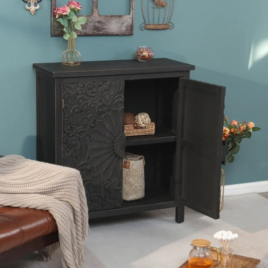 Natural Hand Carved Black Color Wooden Sideboard Cabinet