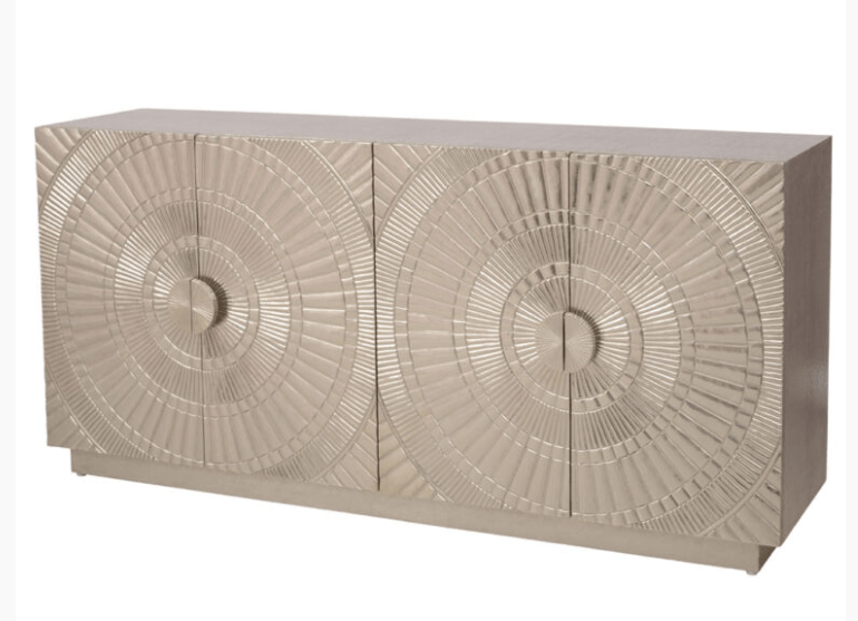 The Designer Beach House Style Embossed Silver Indian Metal Sideboard is a dazzling showstopper that brings a splash of vintage glam to your space! Crafted from sturdy wood and wrapped in embossed silver sheet metal, its radiant sunburst design bursts out from charming semi-circular handles, channeling the bold and playful spirit of the roaring 1920s. Behind its four doors lies a generous long shelf, ready to stash everything from your fanciest dinnerware to your secret stash of cocktails. Whether you use it as a cheeky drinks cabinet, a stylish sideboard, or simply a stunning storage solution, this piece promises to add a fun and opulent flair to any room!.