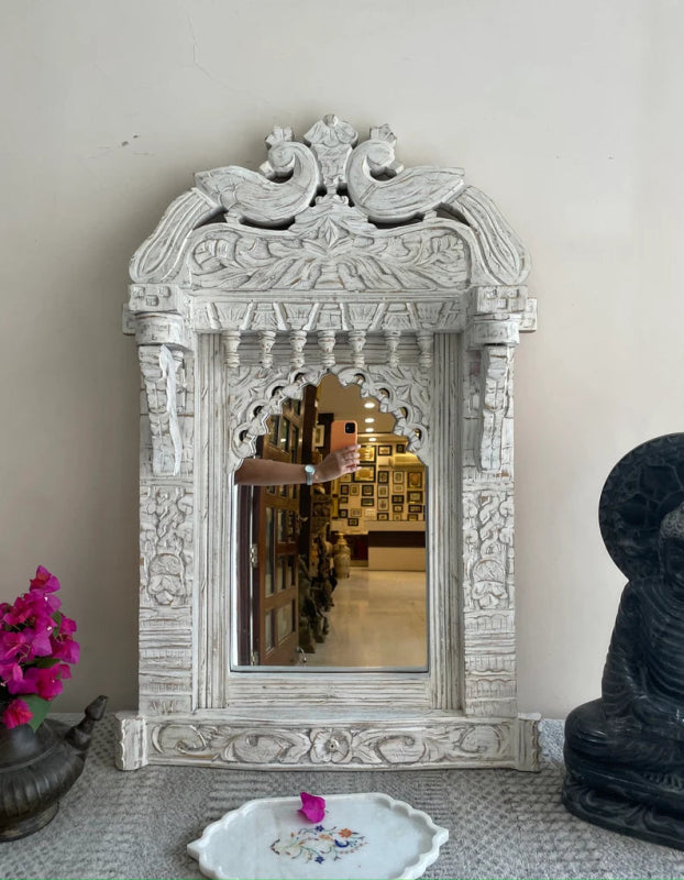 This exquisite hand-carved mirror frame, featuring a stunning peacock design, adds a touch of luxury and sophistication to any wall in your home. Perfect for adding a touch of elegance to your bedroom or bathroom, this solid wooden frame is a true work of art.