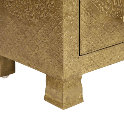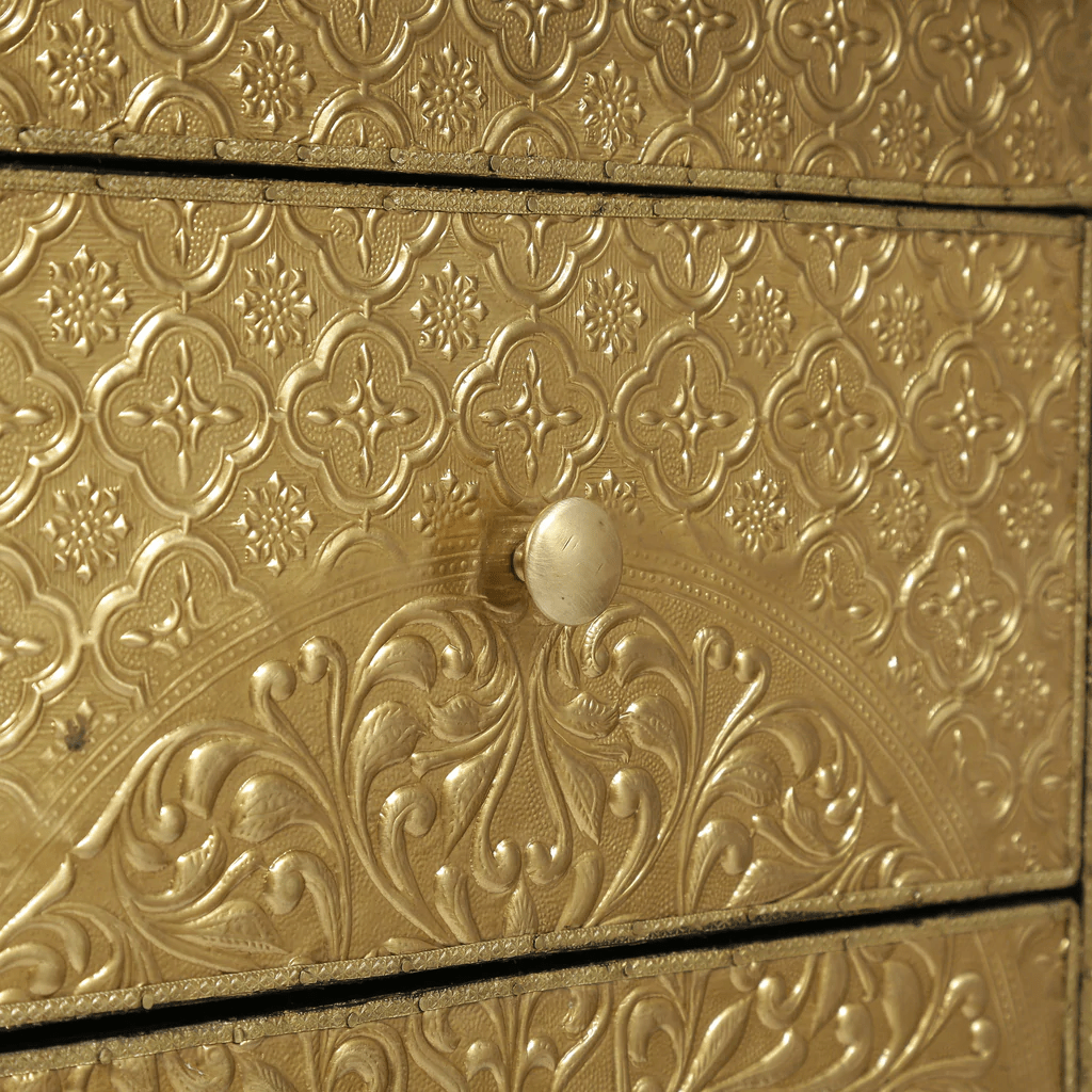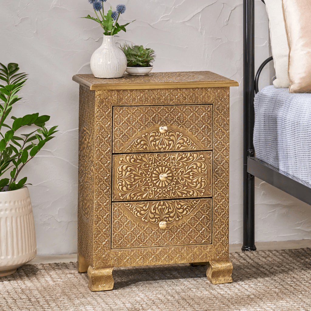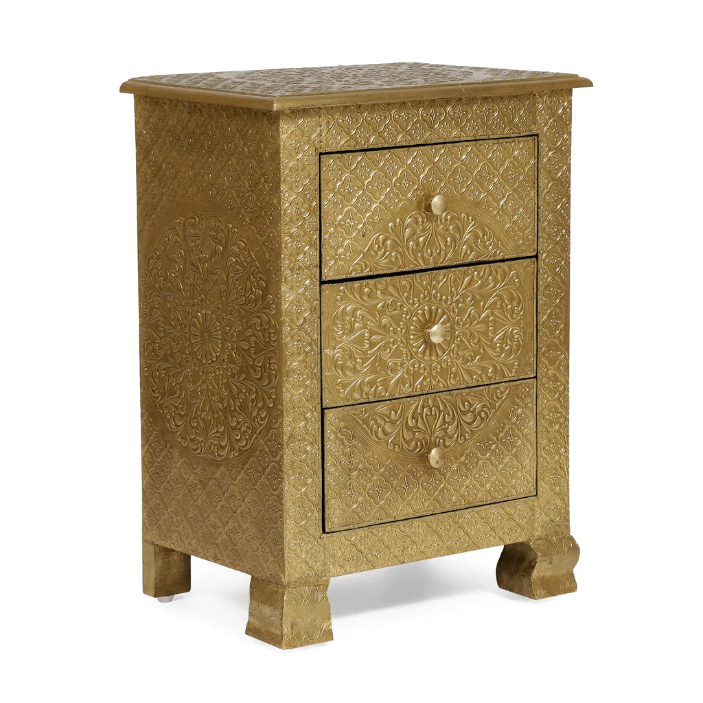 Handmade Embossed Three Drawer Nightstand | Antique Brass or Silver Bedside