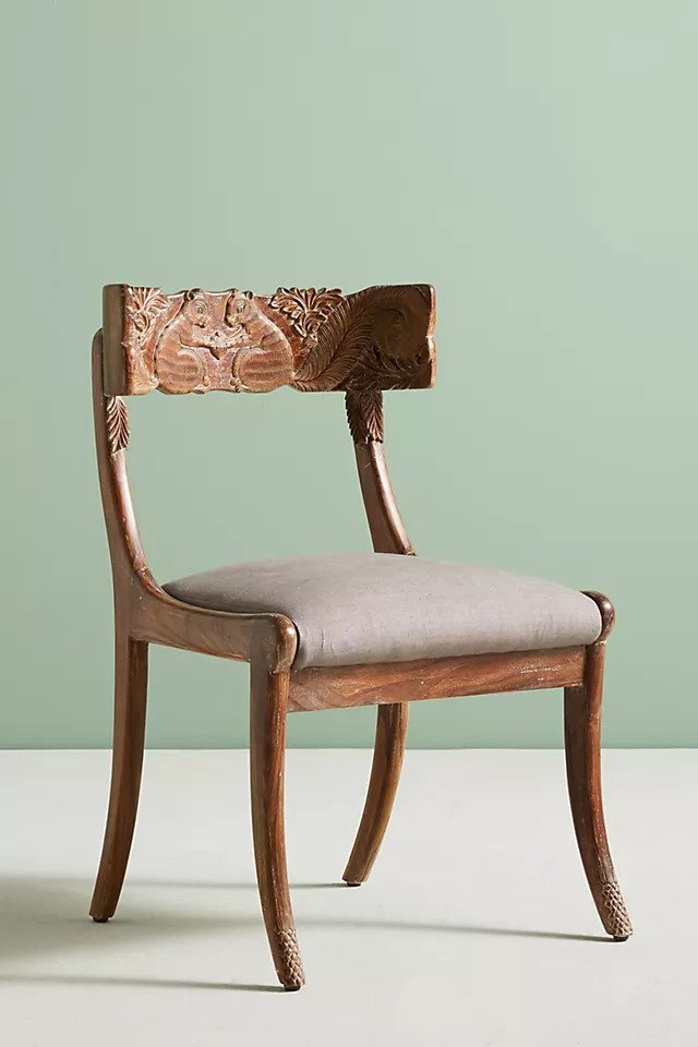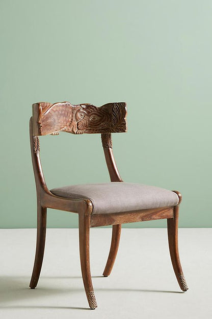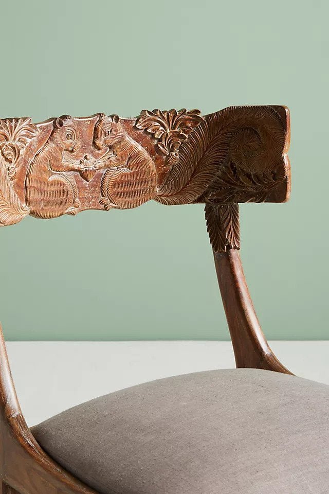 Hand-carved Fable Dining Chair Winsome Forest dwellers - rendered in hand carved teak wood - frolic along the back of this elegant midcentury dining shape, finished with flared legs and a linen-upholstered seat. Indulge in the timeless elegance of our Hand Carved Fable Wooden Dining Chair, part of our exclusive Indian Furniture collection. Crafted with intricate wood carvings, this piece showcases the rich heritage of traditional Indian furniture.