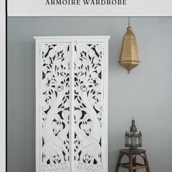 This hand-carved elephant armoire is truly exceptional! The white finish highlights the intricate elephant design beautifully, making it a standout piece in any room. The craftsmanship is top-notch, blending artistic detail with functional storage. It’s both charming and practical—highly recommend!