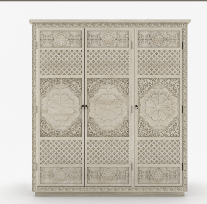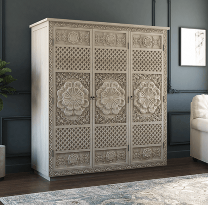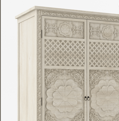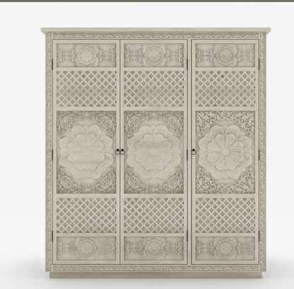 White Painted Three Door Sunflower Armoire – Hand Carved Solid Wood Storage
