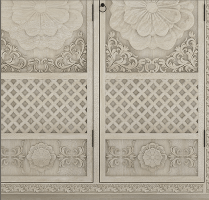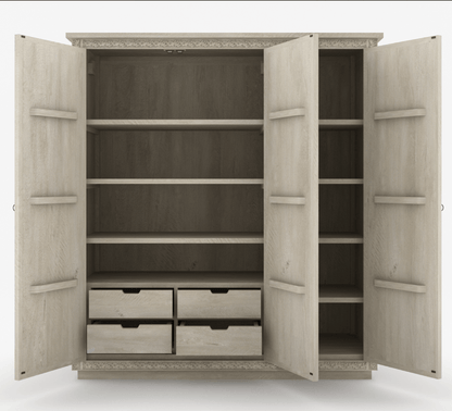 The White Painted Three Door Sunflower Armoire, made from hand-carved solid wood, brings a touch of luxury and exclusivity to your room or bedroom. This elegant piece not only enhances your décor but also provides ample storage for your belongings. Perfectly suited for French country, shabby chic, or western-style interiors, this sophisticated armoire combines beauty and practicality to enrich your living space.