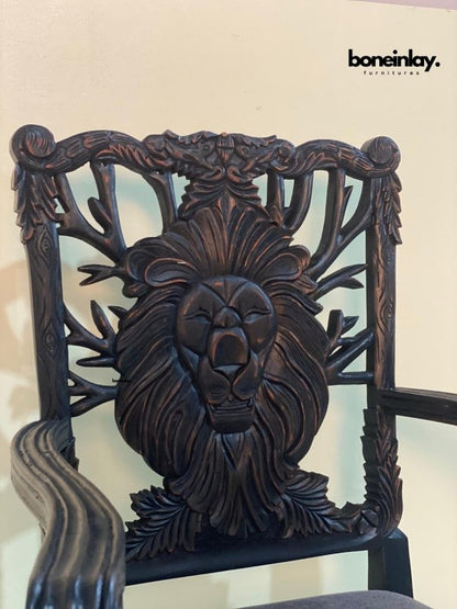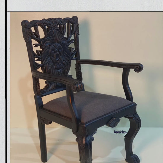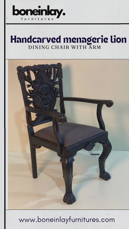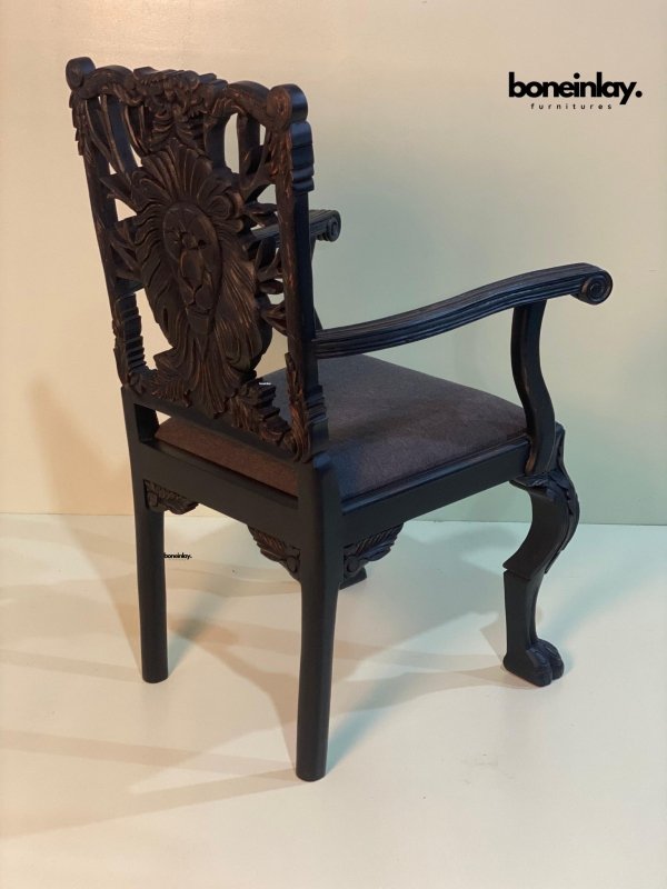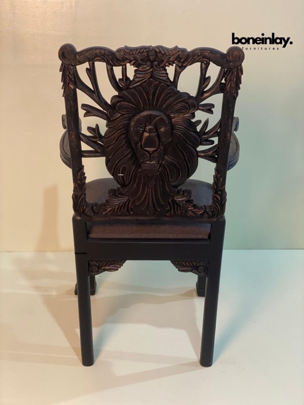 Indulge in decadent dining with our Hand carved Black Menagerie Lion Dining Chair. Crafted with intricate details and custom designs, this lion chair adds an air of luxury to any dining experience. The striking black finish exudes sophistication and elegance, making it the perfect addition to your dining table. Elevate your dining experience with our Hand Carved Black Menagerie Lion Dining Chair, featuring exquisite wood carving and a traditional Indian design. Crafted with sophistication and elegance, this piece adds a touch of luxury to any room.