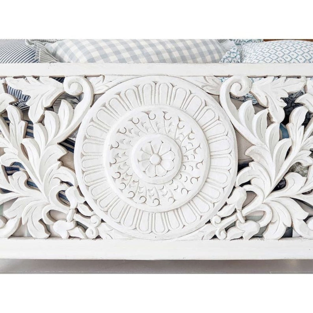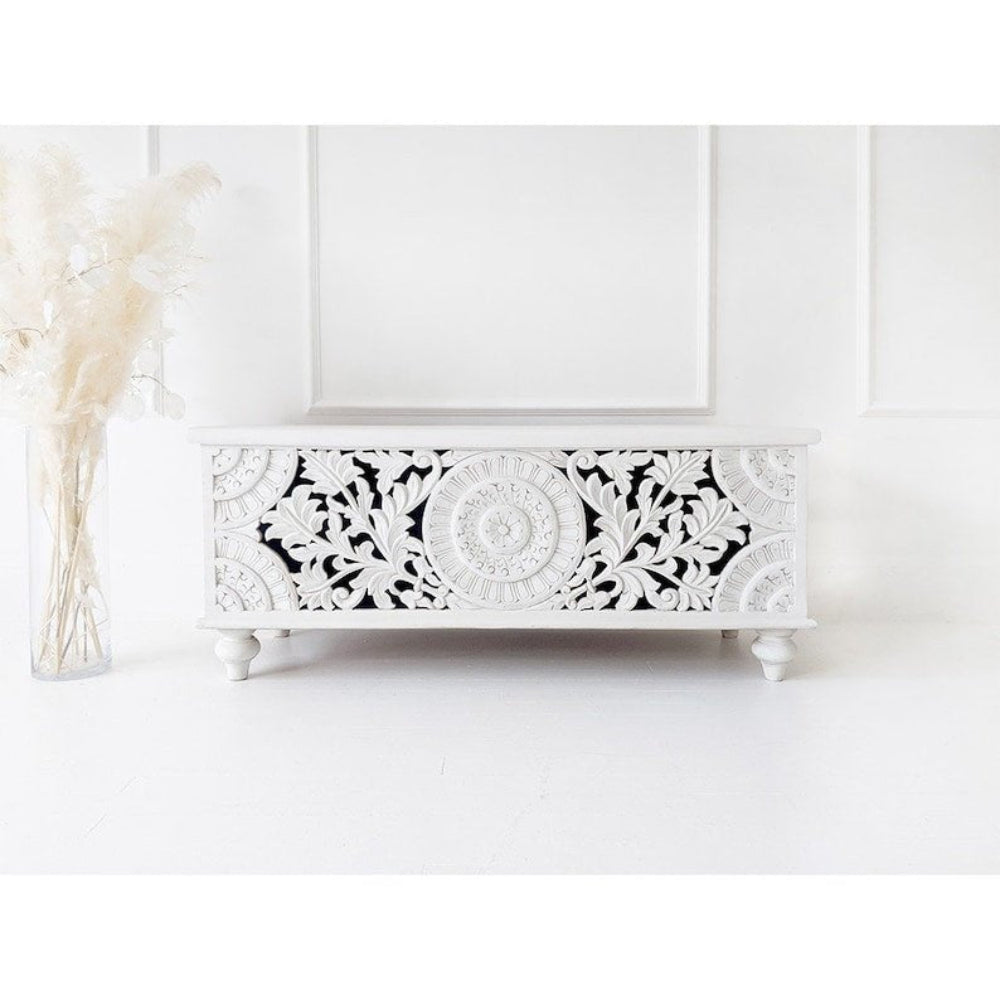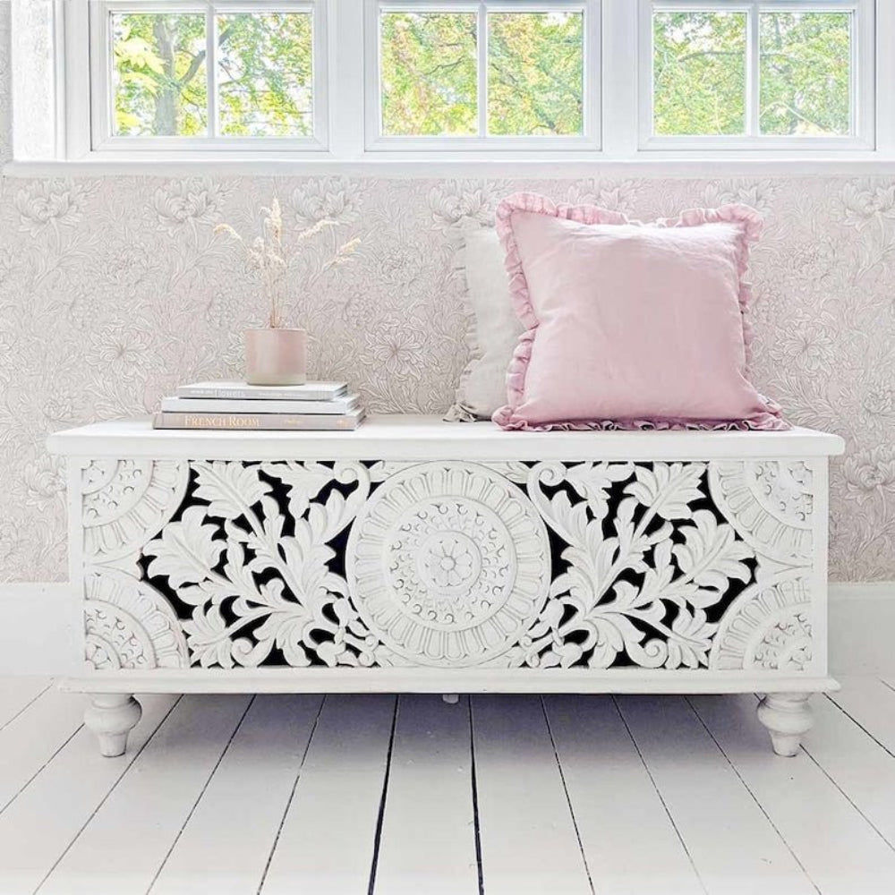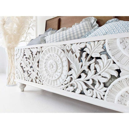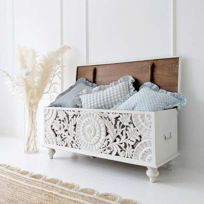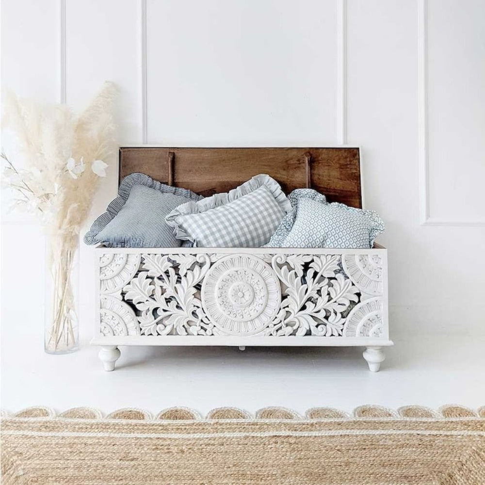 This hand carved Lombok Blanket Box is made from tropical hardwood with a beautiful flower design. The intricate carving is inspired by Indian craftsmanship and adds a unique touch to any room. Made with high-quality materials and expert craftsmanship, this bench is both functional and aesthetically pleasing.