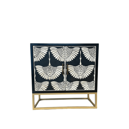 The beautiful art of inlay is specific to the Udaipur region of India. Our Black Color Bone Inlay Ibis Swan Cabinet by the skilled artisans of Udaipur, India, with an intricate design in tonal black. The stunning mosaic of flat patterns embellishing the cabinet's twin doors makes this storage unit a singular piece.
