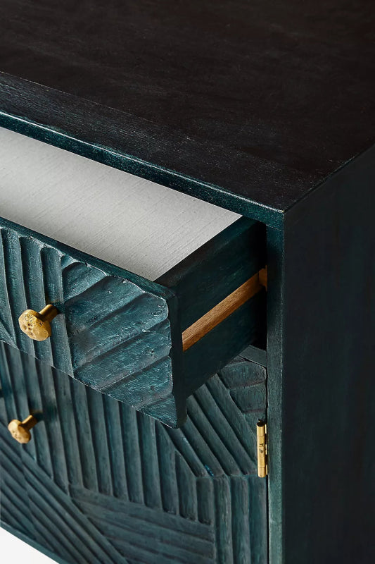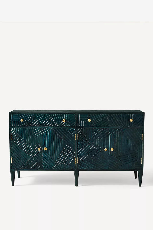 The Elegant Hand-Carved Paje Buffet Cabinet showcases beautifully detailed crisscross patterns in a deep indigo shade, blending timeless artistry with modern design. This wood sideboard offers generous storage through multiple drawers and cabinets, making it ideal for organizing serve ware, dinnerware, and utensils. Perfect for dining rooms or eat-in kitchens, it combines functionality with style, helping you keep your space neat while adding a sophisticated touch to your home décor. Its handcrafted quality ensures durability and a unique character that enhances any interior setting.