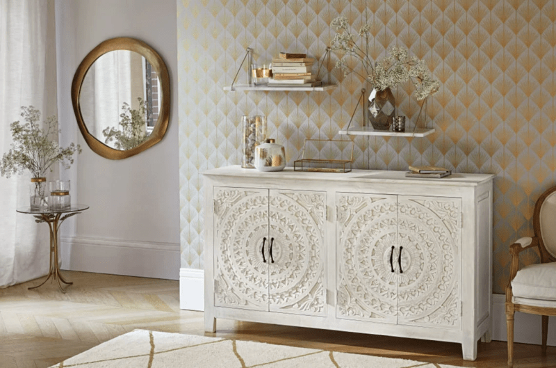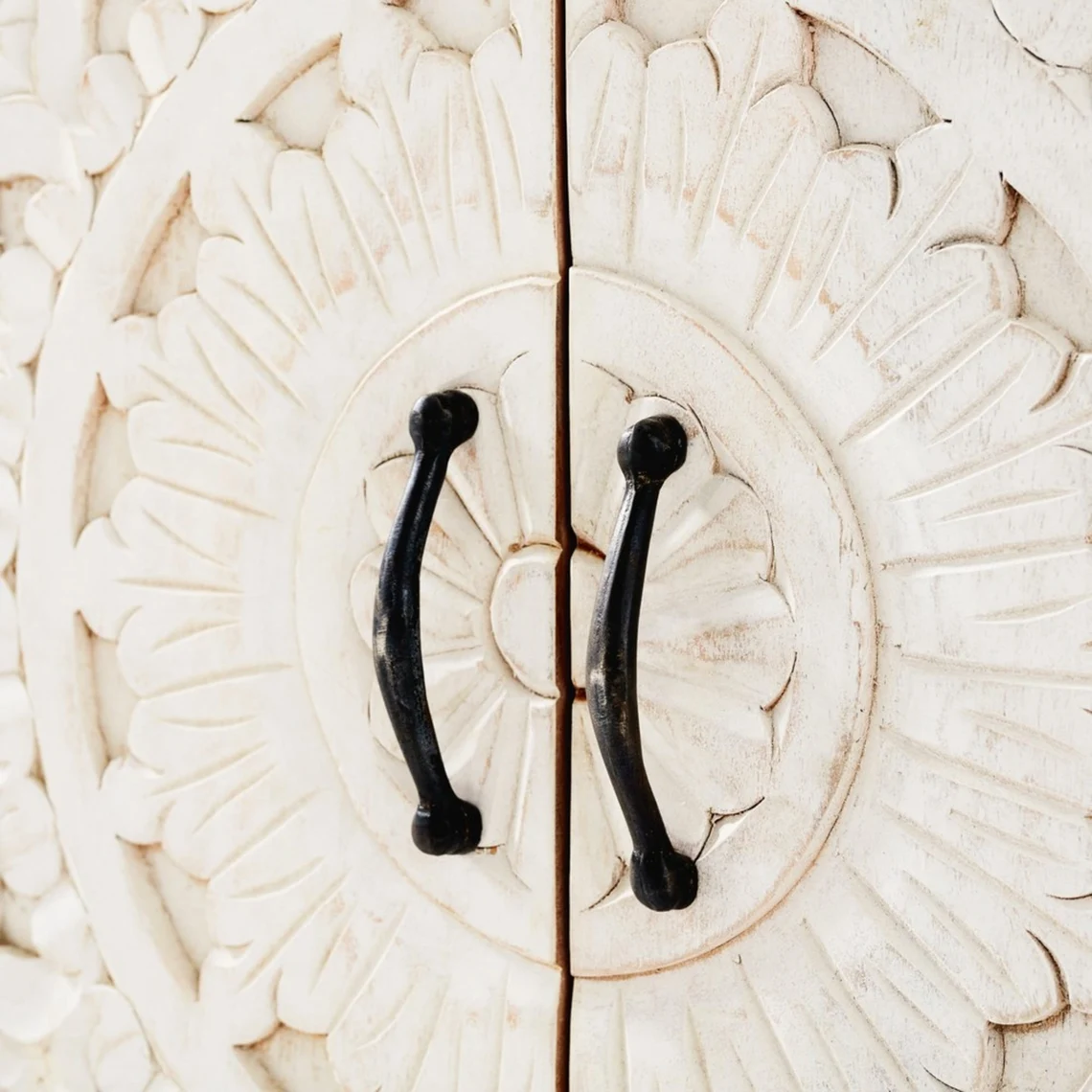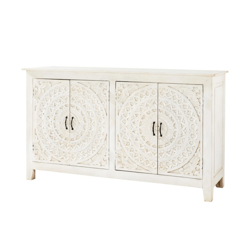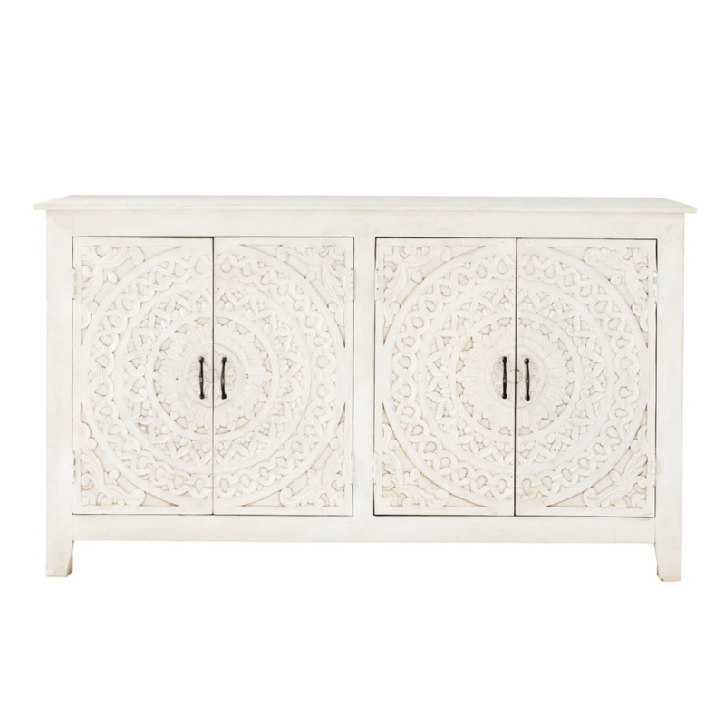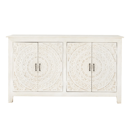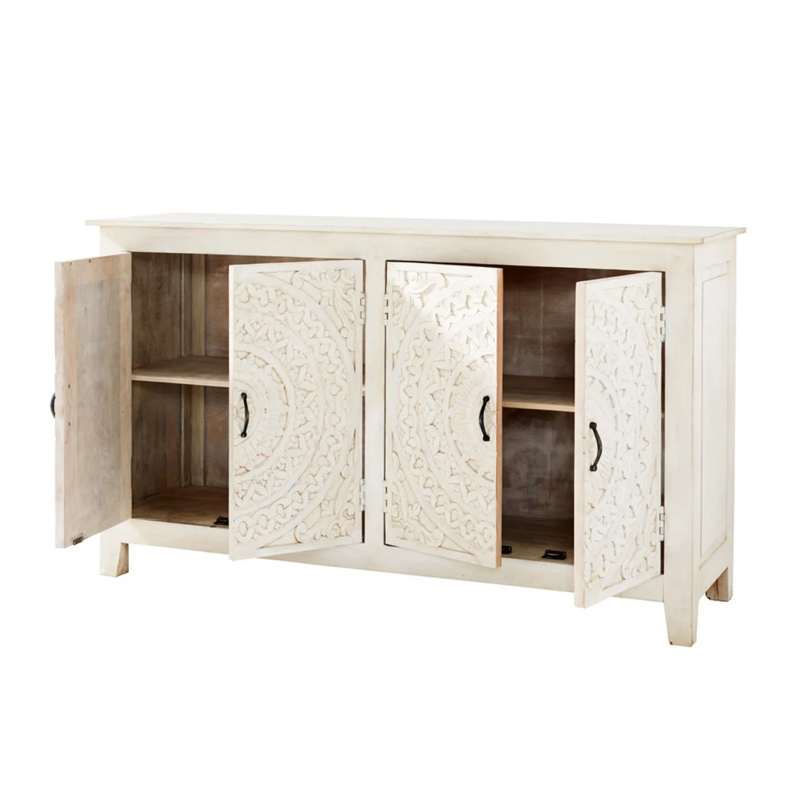 White Solid Wood Buffet Table | Four Door Hand-Carved Sideboard