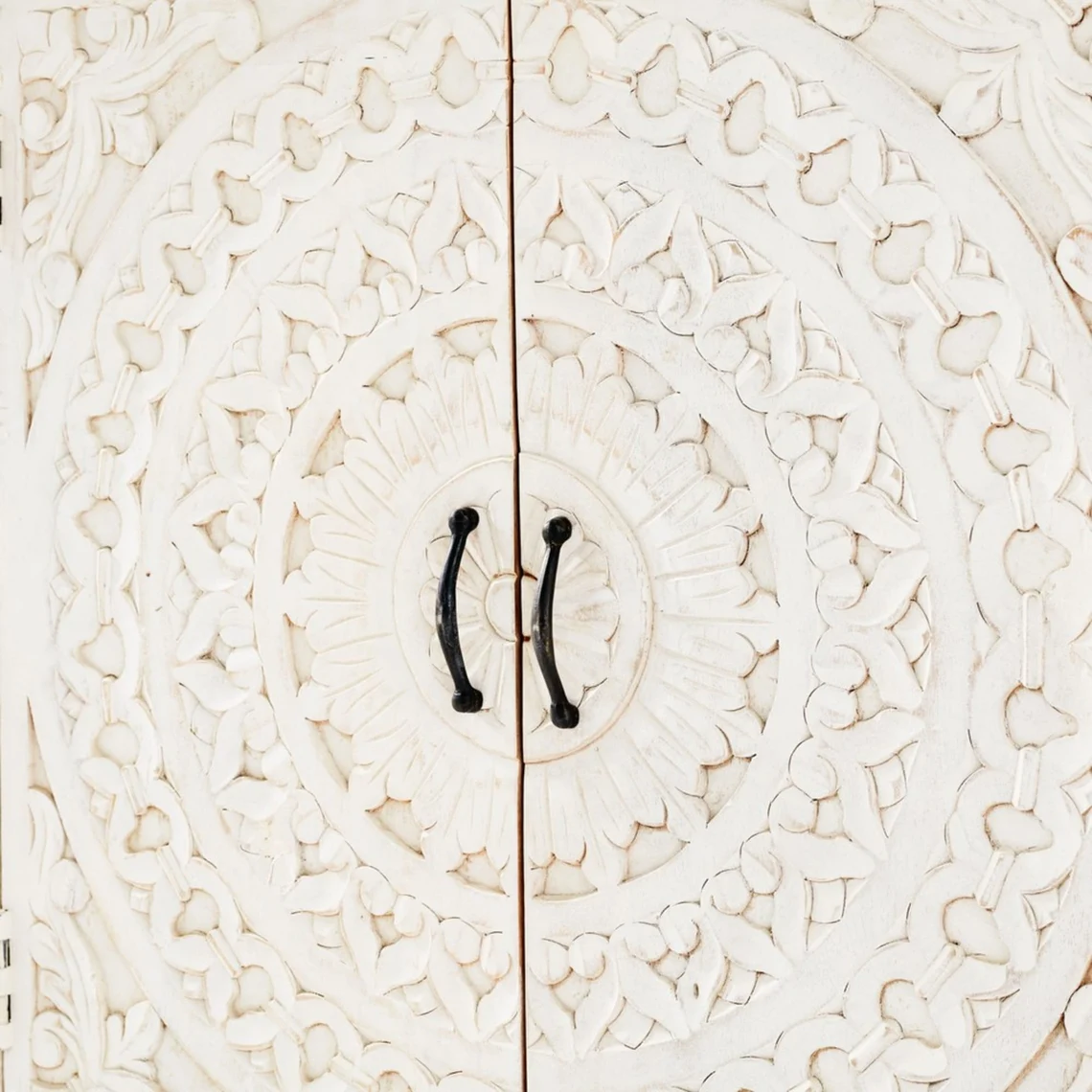 Add a splash of creativity to your space with this charming white wood buffet table, featuring four beautifully detailed doors that open to reveal two handy removable shelves—perfect for keeping your favorite items neatly tucked away. The bright white finish creates a fresh backdrop for your playful décor, while the intricate hand-carved designs bring a touch of artistic flair to any room. Use the top surface to showcase a quirky lamp or a collection of colorful treasures, turning this sideboard into a lively centerpiece that sparks joy and invites conversation. Each piece is a unique work of art, ready to brighten your home with personality and style.