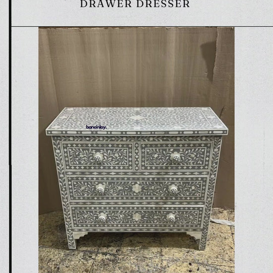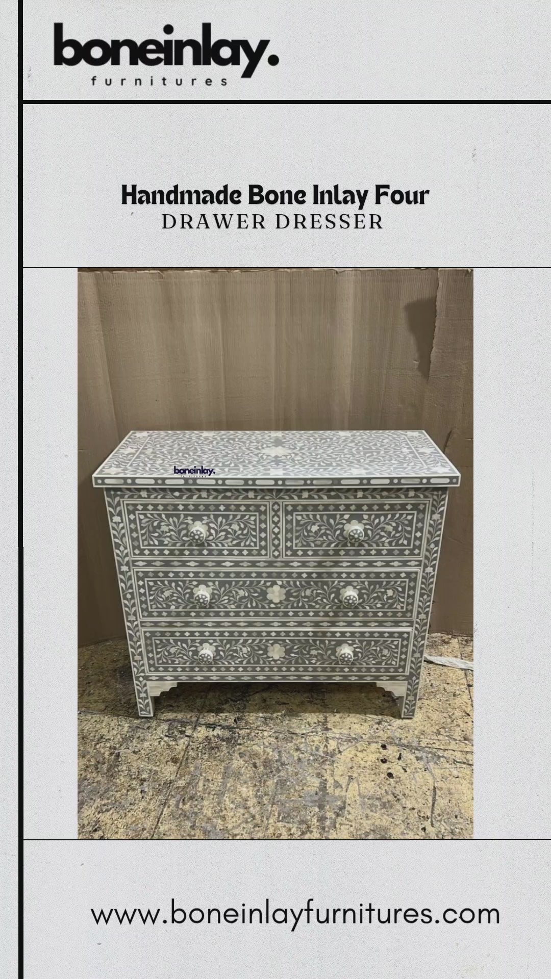 This artisan bone inlay design chest of drawers will add a timeless beauty to any room. Featuring a stunning mosaic pattern, this versatile chest of drawers includes two large lower drawers and two small upper drawers, making it perfect for all manner of storage while enhancing your home with an aura of Indian opulence. Crafted with exquisite attention to detail, this beautiful bone inlay dresser for bedroom is available in a wide variety of captivating colors, allowing you to find the perfect piece to complement your decor. Elevate your living space with this elegant and functional furniture staple.